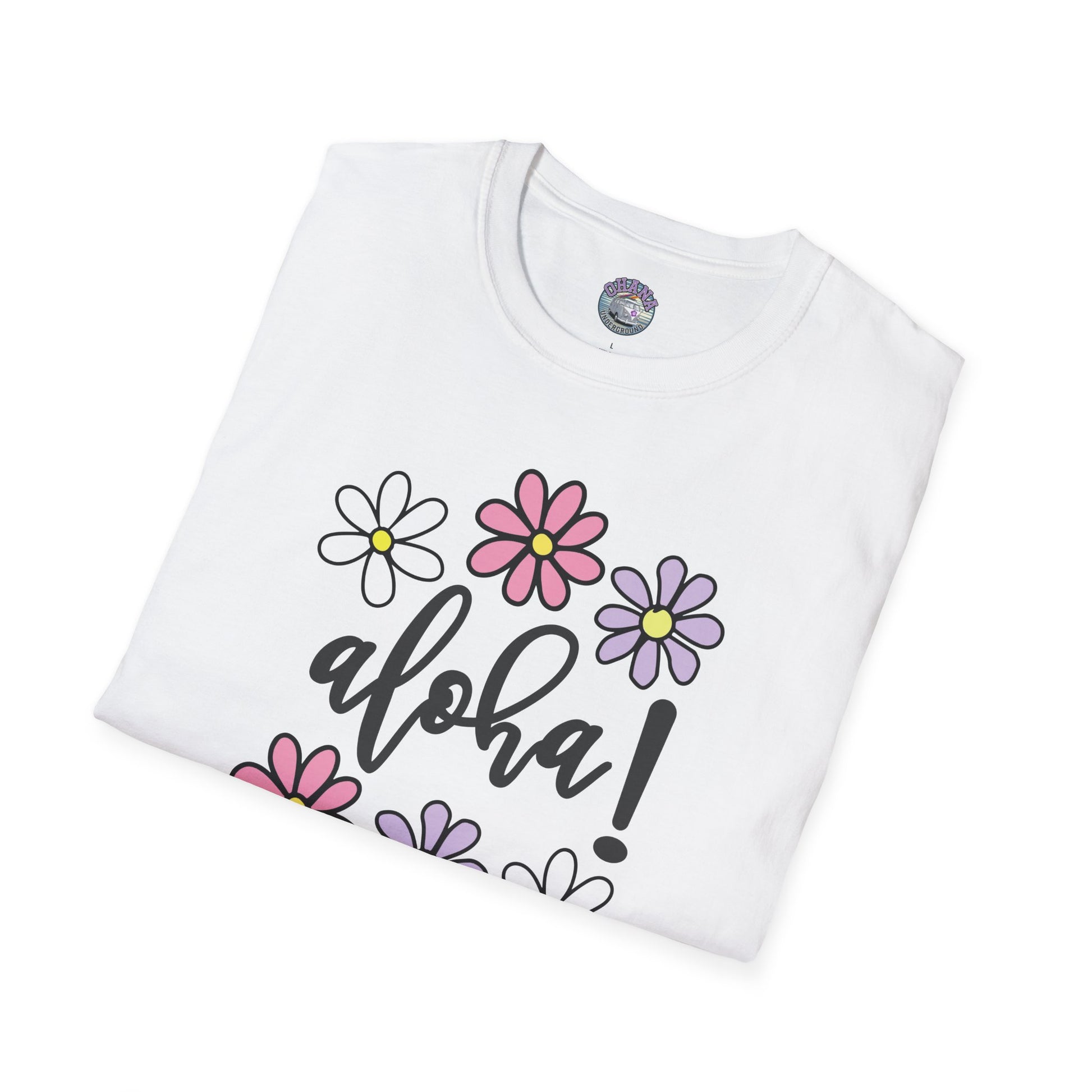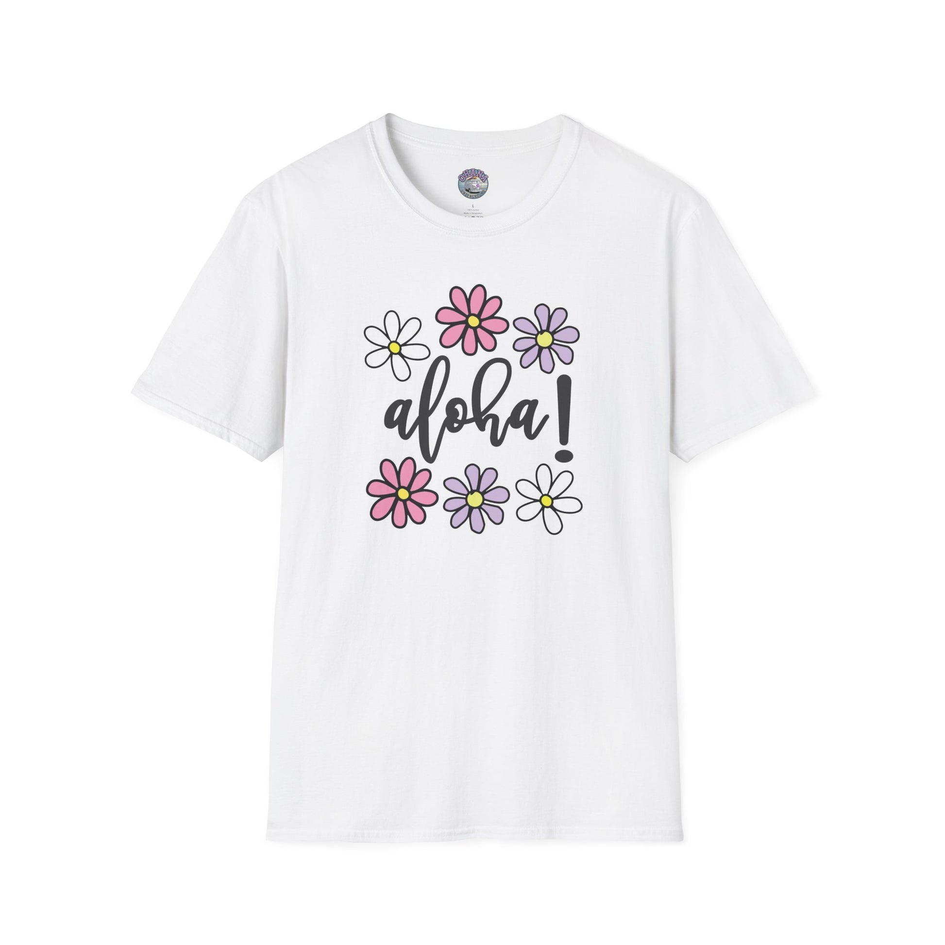 - Playful “aloha!” script surrounded by colorful daisy-style flowers on a crisp white tee.