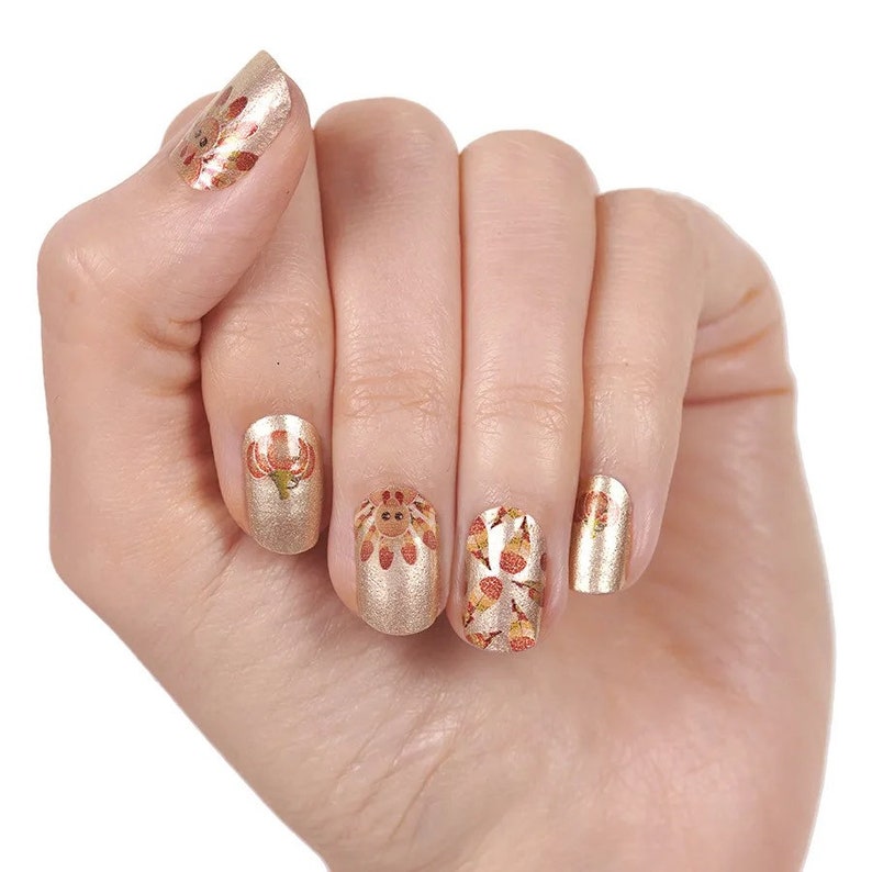 Top your tips with Feathered Friends, a shimmery gold mixed design of turkey faces, turkey feathers, and plump pumpkins!