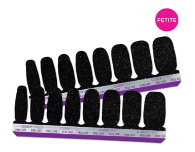 Meet Starfall (Petite): a night-sky black dusted with silver glitter for instant drama. Sized for small nail beds, these real polish strips flex to your nails for a smooth, glossy finish in minutes—zero smudging, zero wait.