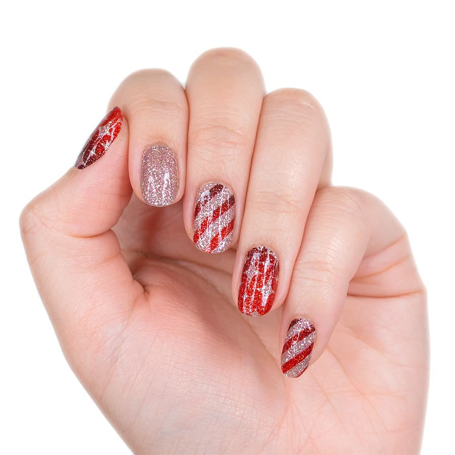 Add a festive touch to your nails with Wrap It Up, a sparkling gold and red wrapping paper design of stripes and diamond shapes.