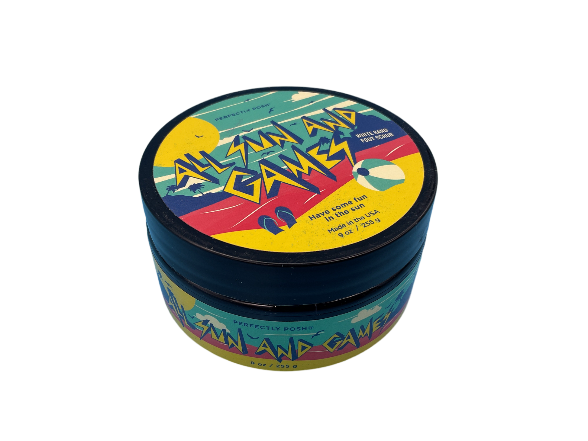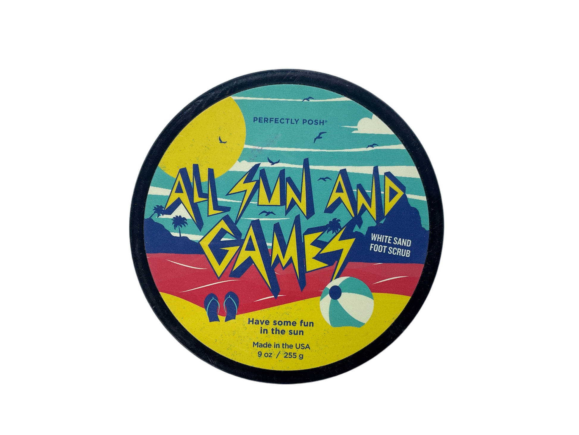 - Retired Perfectly Posh All Sun and Games White Sand Foot Scrub in a full-size 9 oz (255 g) jar.